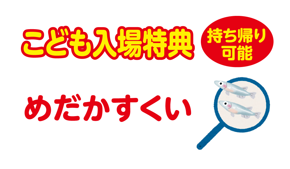 ※カブクワ釣り、めだかすくいは特典付きチケットでご利用できます。カブクワ釣り、めだかすくい体験のみは300円チケットをお求めください。