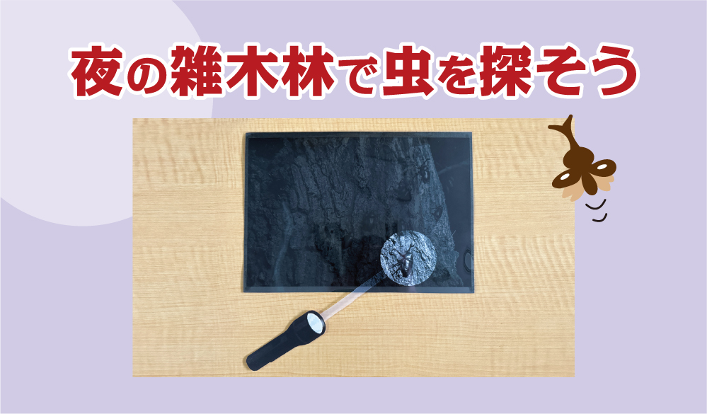 真っ黒な紙を、紙で作ったライトで照らすと、樹液に集まってきているカブトムシやクワガタムシがみつかるはずです。ライトを上下左右に動かして、どこに虫がいるかを探してみてください。夜の雑木林の探検を体験できる不思議なアートです。