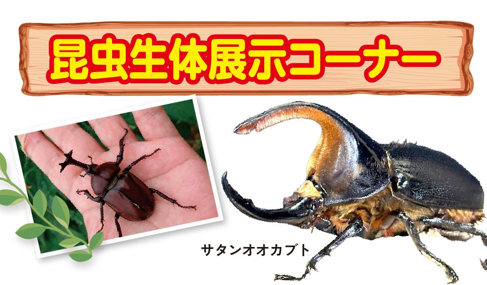 ヘラクレスオオカブトやコーカサスオオカブトなど、約300匹の昆虫とふれあえるチャンス!木や枝を使った自然な環境で、SNS映えする写真撮影も楽しめます。